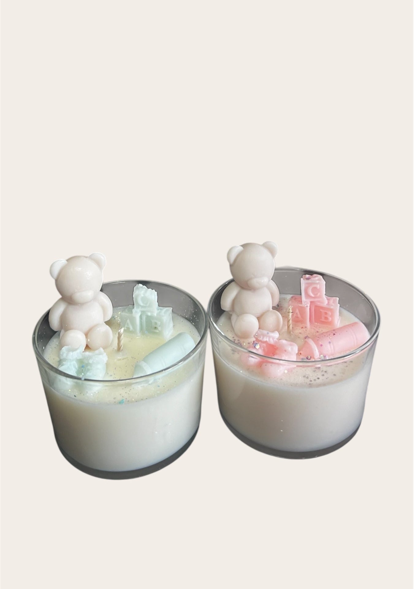 Deze leuke kaars, met liefde handgemaakt, heeft een schattig beerontwerp en is beschikbaar in zowel blauw, roze, beige en blauw met roze.