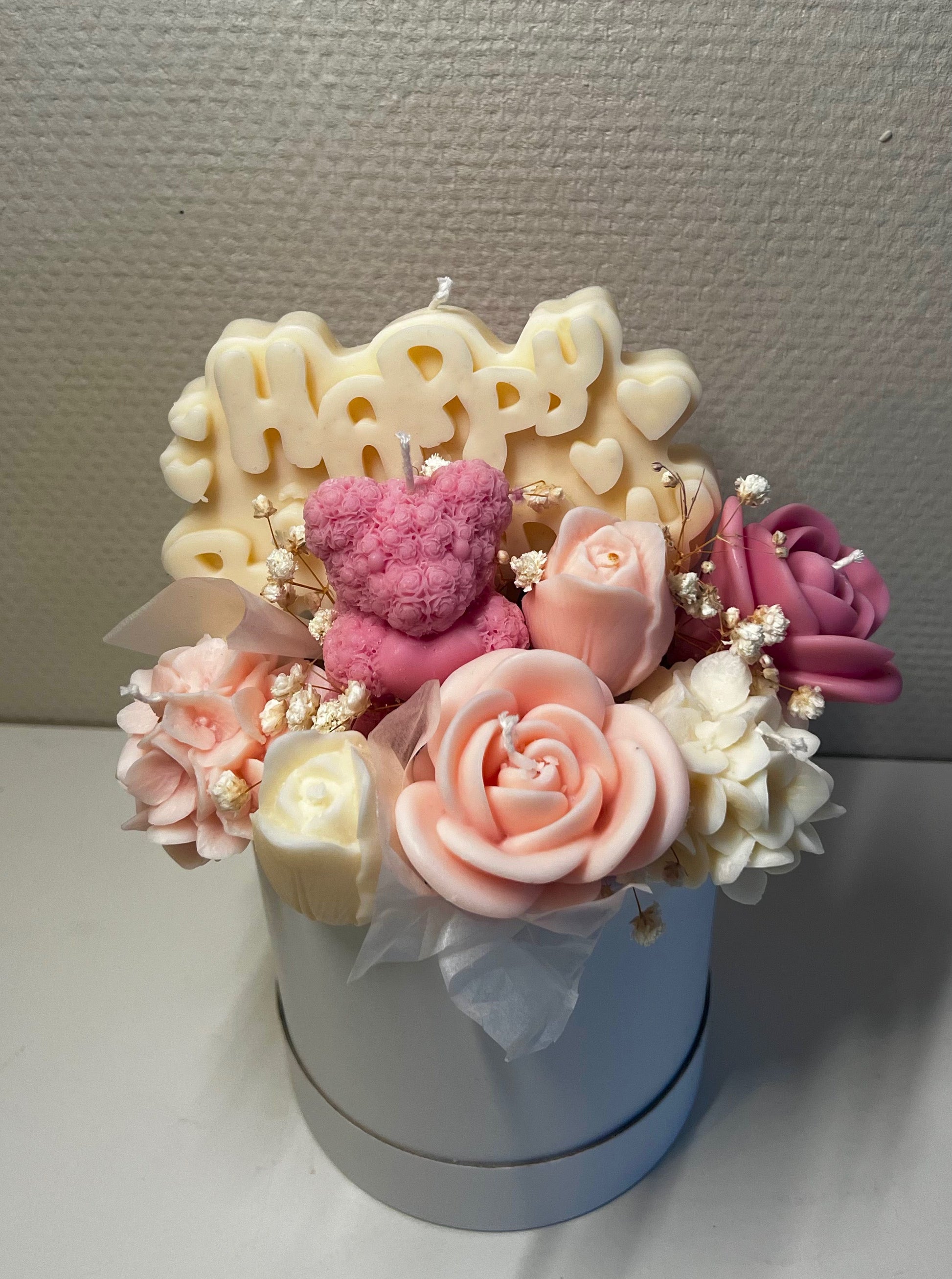 Deze stijlvolle giftbox is gevuld met handgemaakte kaarsjes en waxmelts, perfect om iemand cadeau te geven voor een verjaardag dit door de “happy birthday” kaars die erin zit!