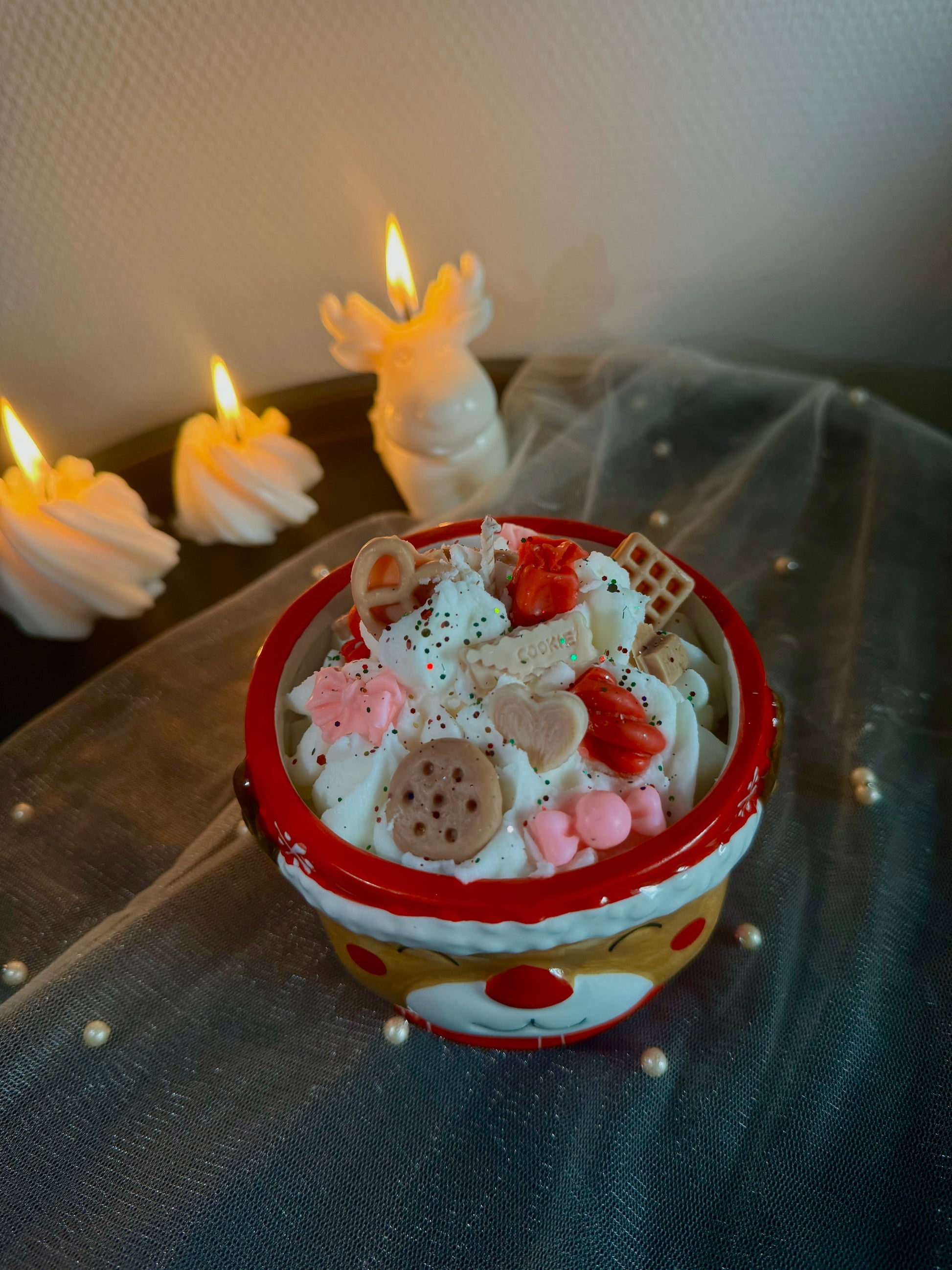 Breng de gezelligheid van de feestdagen in huis met deze charmante kaars in een rendier-, kerstman- of sneeuwpop-schaaltje. Niet alleen een sfeervolle decoratie, maar ook een heerlijke traktatie! Elk schaaltje is gevuld met een kerstkaars in de geur Candy Cane en feestelijke kerstsnacks voor een ultieme verwenmoment.