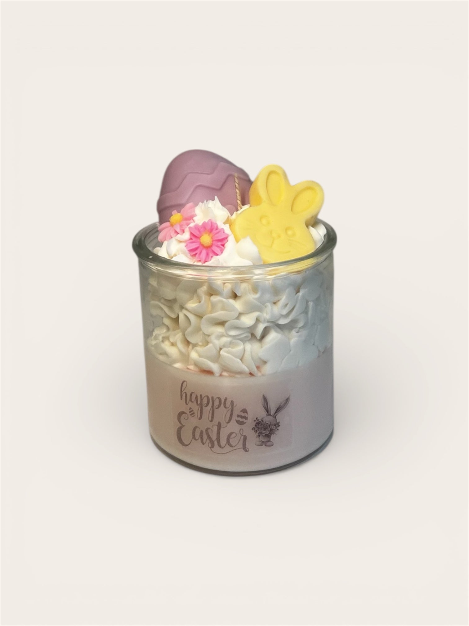 Breng de lente in huis met deze schattige Happy Easter sojakaars. Deze handgemaakte kaars is gegoten in een stijlvol glazen potje en afgewerkt met speelse paasdecoraties, waaronder een paasei, een konijntje en vrolijke bloemetjes. De romige swirl bovenop geeft de kaars een luxe, dessertachtige uitstraling. Met een heerlijke geur van lente bloemen!