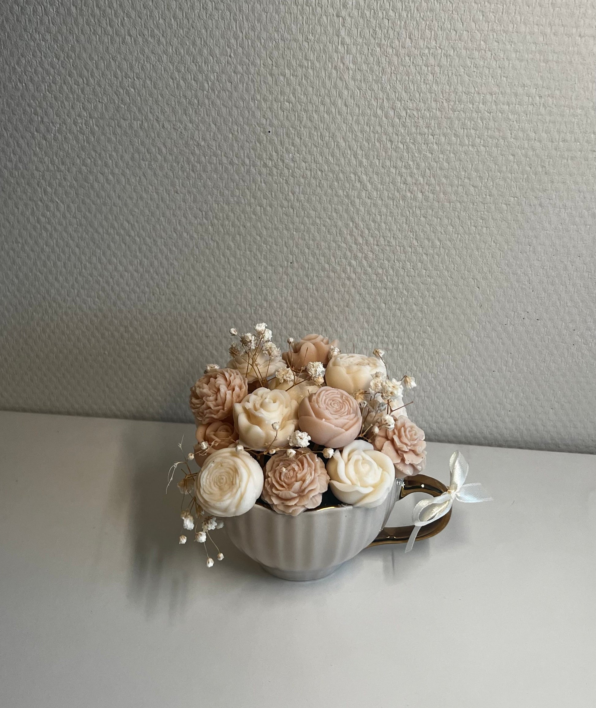 Deze elegante mok is gevuld met handgemaakte waxmelts in de vorm van zachte rozen, afgewerkt met fijne droogbloemetjes. De romantische kleuren in crème en blush geven een luxe, serene uitstraling en maken dit product perfect als decoratie én geurbeleving.